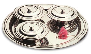 Servizio "Misia": 4 coppette con coperchio cm 14 con vassoio cm 35 acciaio inox 18/10